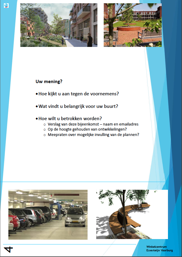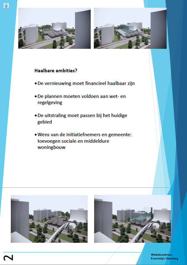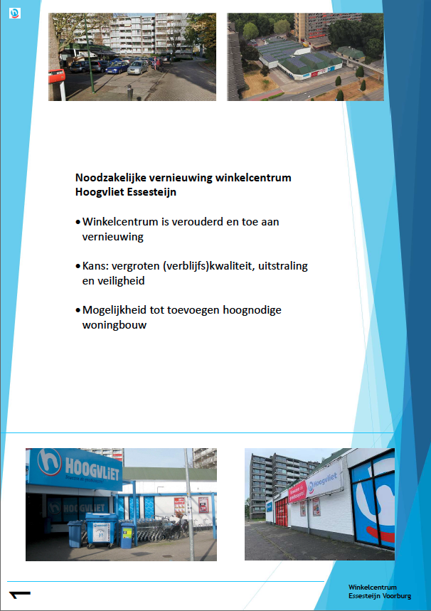 Vernieuwing van het winkelcentrum; winkelcentrum is sterk verouderd en aan vernieuwing toe, kans tot vergroten verblijfskwaliteit, uitstraling en veiligheid, mogelijkheid tot toevoeging woningen