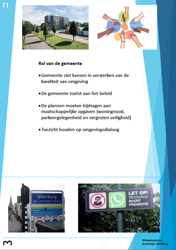 Rol van de gemeente: kansen in versterken omgeving, toetsen aan beleid, bijdragen aan maatschappelijk opgaven (woningnood, parkeergelegenheid, vergroten veiligheid) en toezicht houden op omgevingsdialoog.