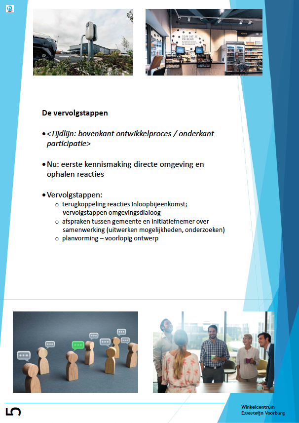 Vervolgstappen: nu een eerste kennismaking met de directe omgeving en ophalen reacties, daarna een terugkoppeling van de avond, vervolgens zullen er afspraken tussen de gemeente en de initiatiefnemers over samenwerking gemaakt moeten worden, later kunnen de plannen uitgewerkt worden naar een voorlopig ontwerp.