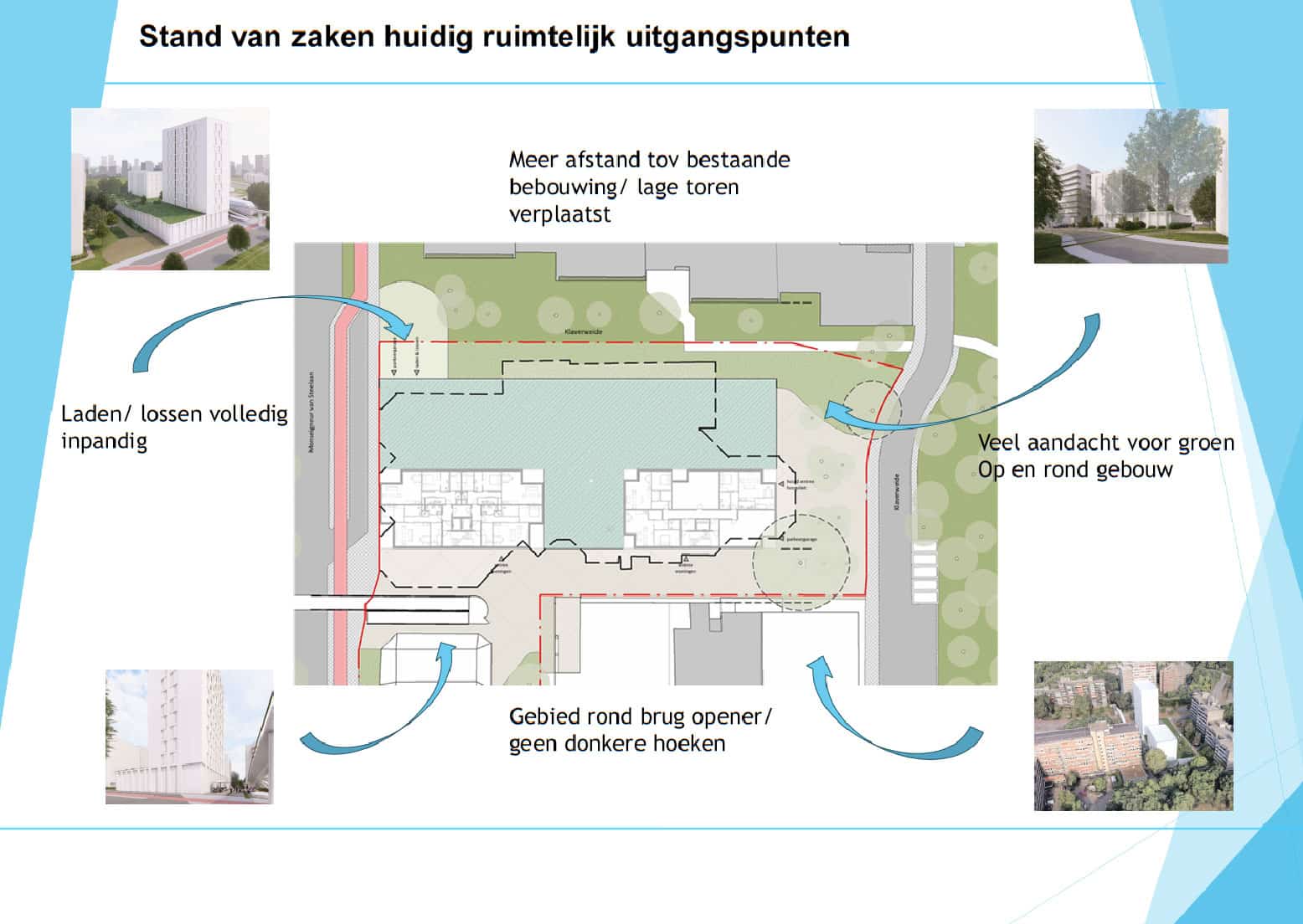 • Uitgangspunten en gemeentelijke kaders: toelichting op de concept-uitgangspunten vanuit de gemeente en de doorgevoerde ontwerpwijzigingen.